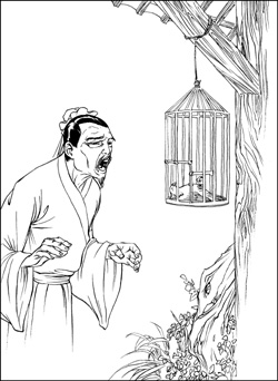 这主人天天回来都要来看一看、玩一玩它,这是他最心爱的一只小鸟,可以和他谈话,又可以给他消愁解闷,所以回来总要先看看这只鸟。这主人一看,哇!简直就要哭起来了!怎么这小鸟躺在笼子里